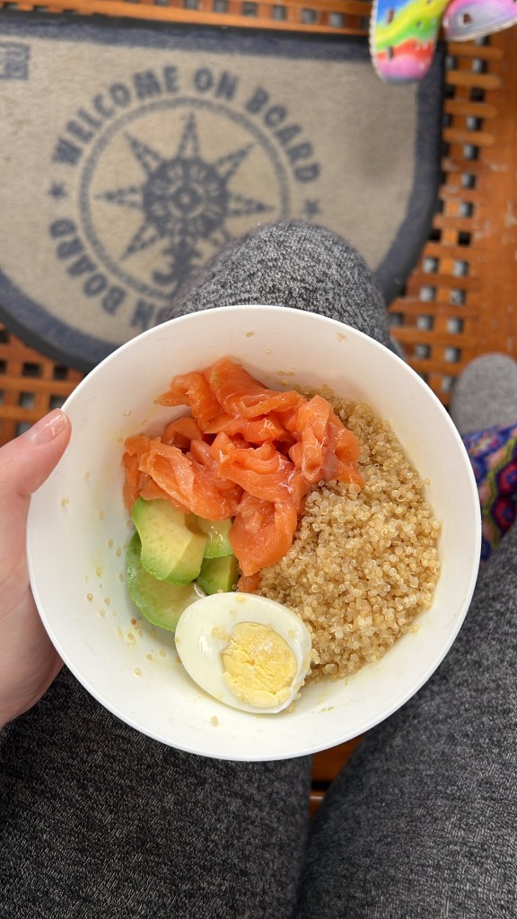 Breakfast was a delicious bowl of quinoa, egg, avocado, and fish. I gobbled it down without hesitation. Feeling extra cocky, I moved around the cabin, at one point even reading my book. Lunch was more vegetable soup – delicious. I returned to reading my book, “How to be a Boss Bitch” by Christine Quinn, feeling invincible from the tumultuous sea.